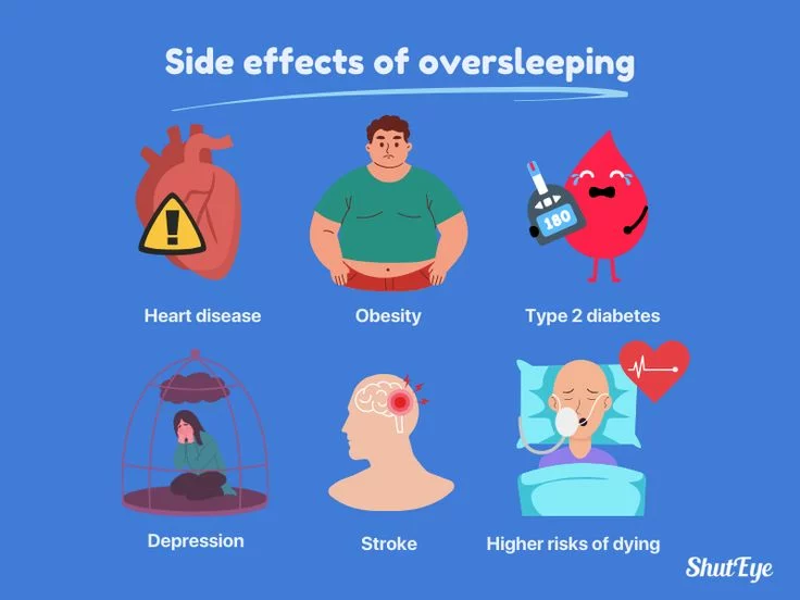 Obesity is also noted. Oversleeping might alter hunger hormones, leading to more eating and weight gain. Plus, spending more time in bed means less time moving.